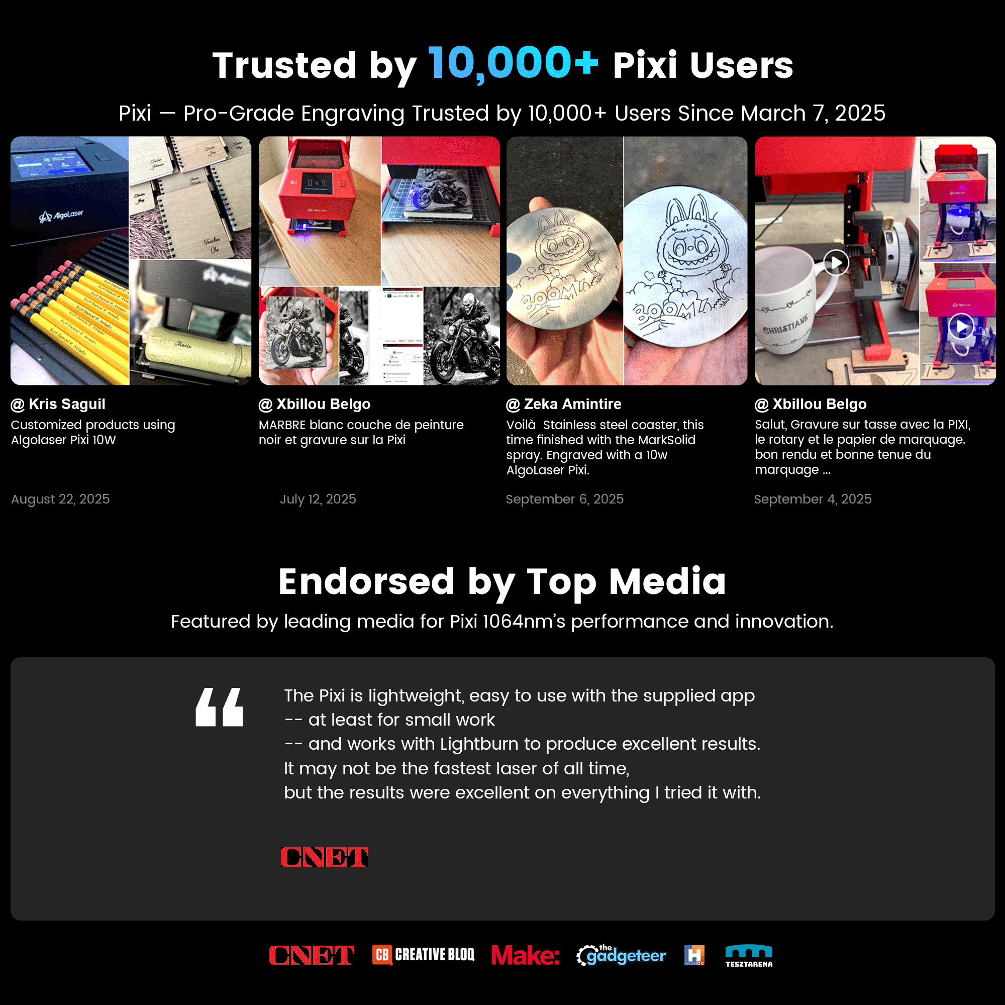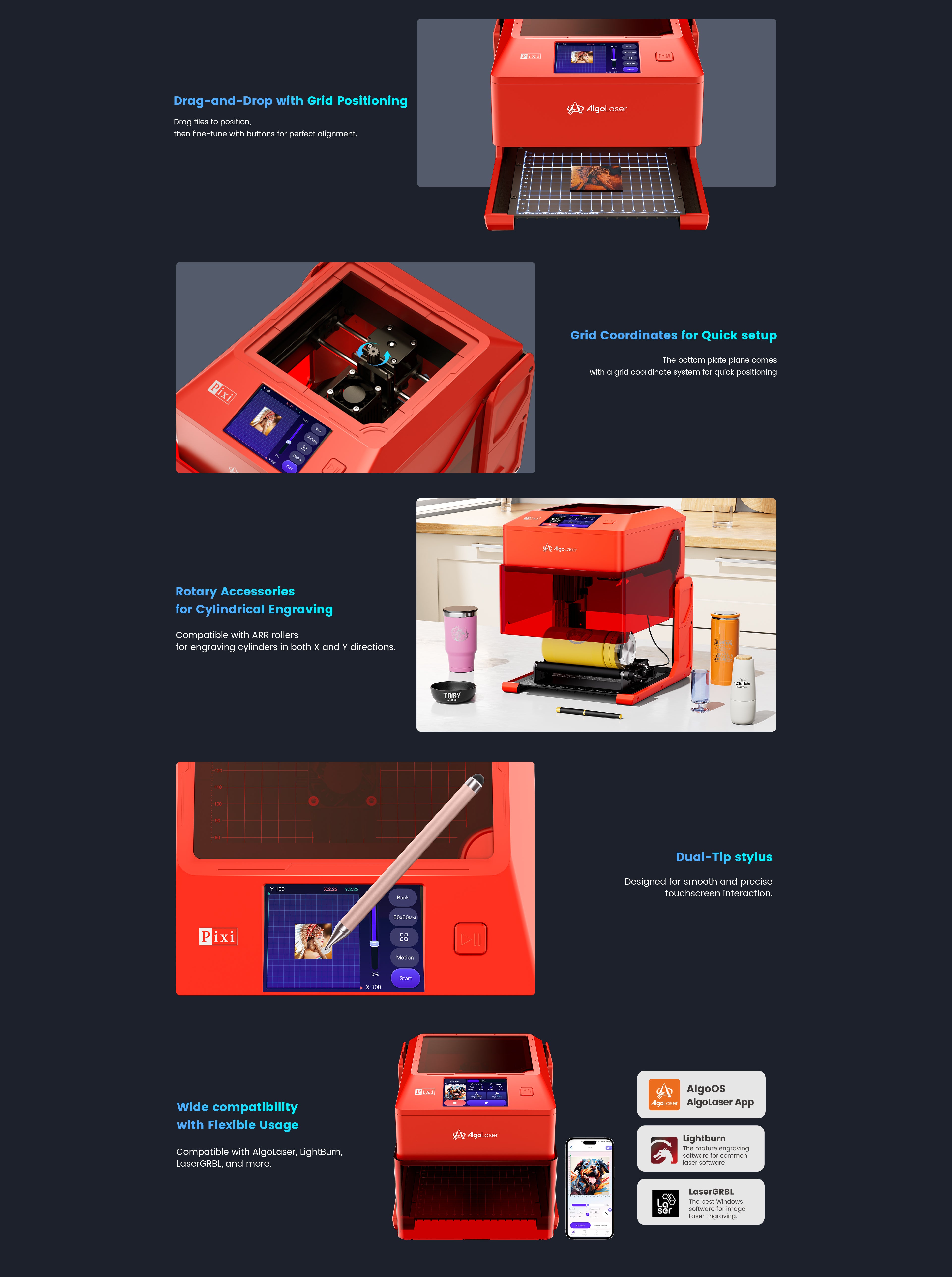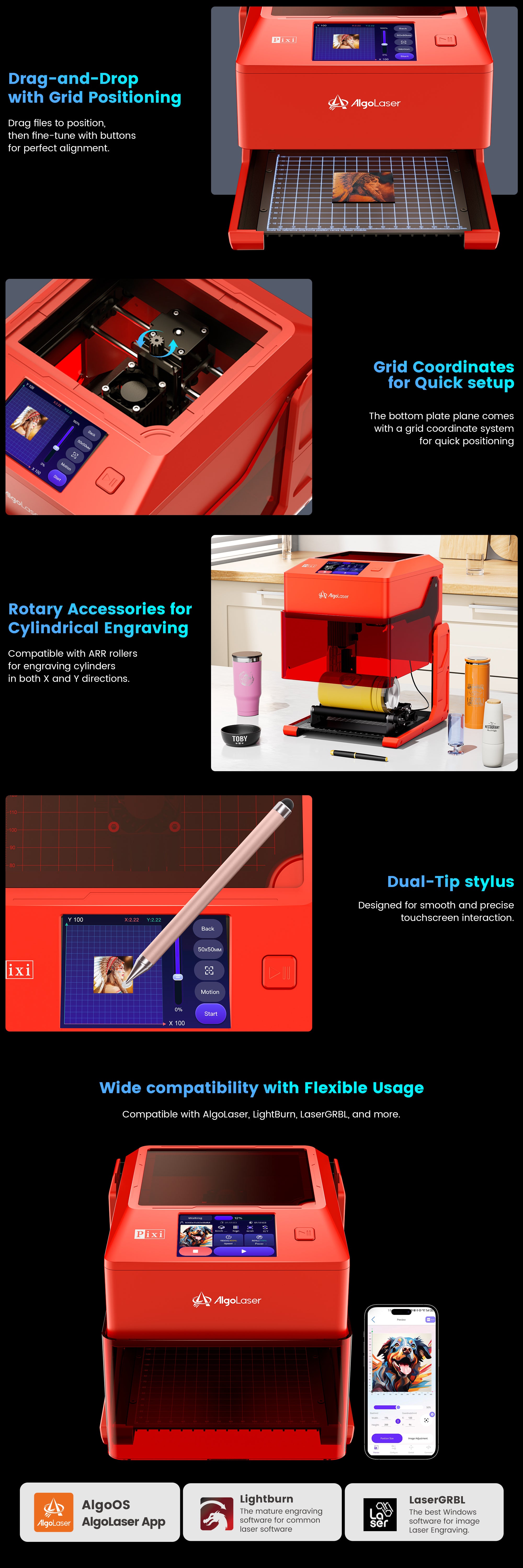 | Software | Aplicación AlgoLaser / Lightburn / LaserGRBL | Aplicación AlgoLaser / Lightburn / LaserGRBL | Aplicación AlgoLaser / Lightburn / LaserGRBL | Aplicación AlgoLaser / Lightburn / LaserGRBL |