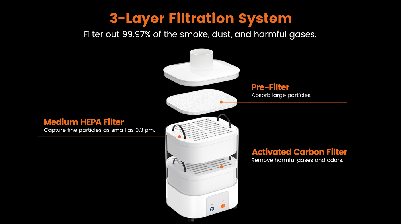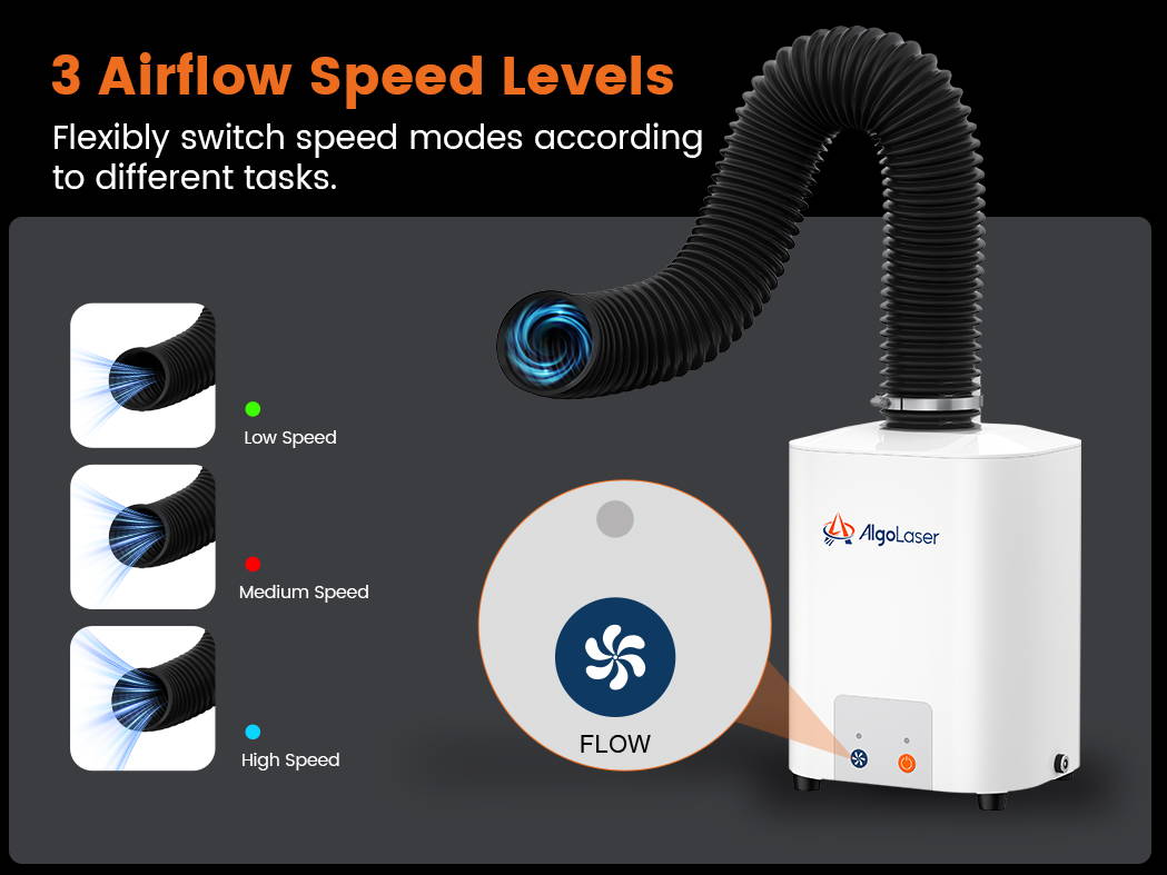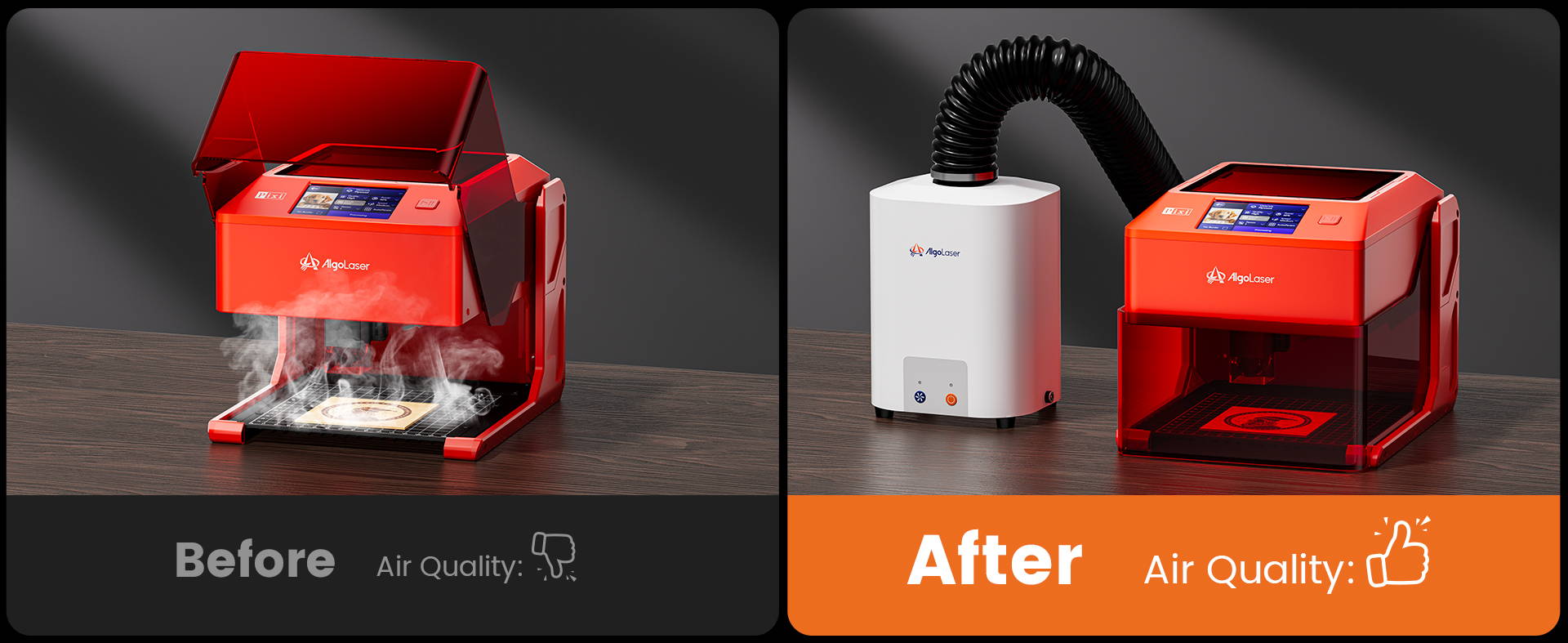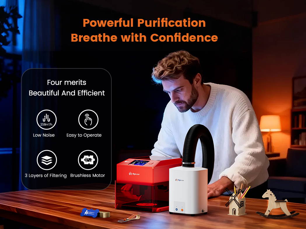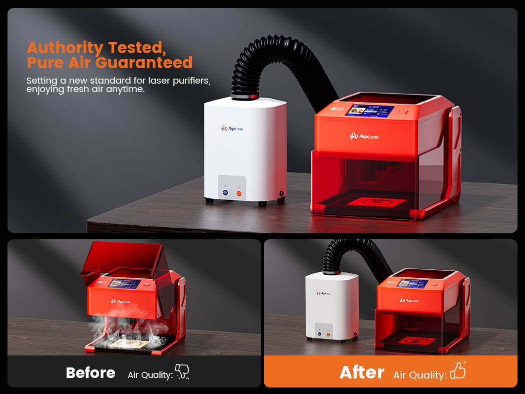 Filma factores dañinos como PM2.5, PM10 y formaldehído generados por talla y cortando madera, cuero y acrílico, con una tasa de purificación de hasta 99.97%. El caudal de purificación es de hasta 258 m³/h, y la velocidad del viento es de hasta 38 m/s. La velocidad de purificación está en un excelente nivel en la industria.